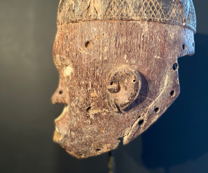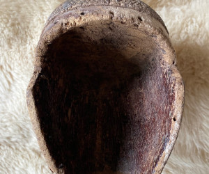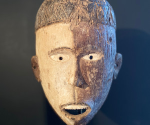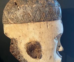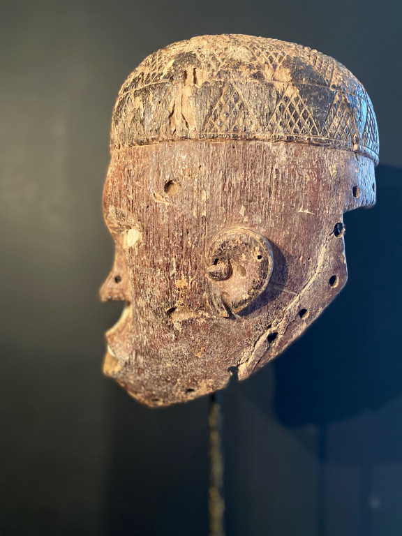 Casque Ngil, de l'ethnie Fang du Gabon, en bois lége, recouvert de kaolin et teinture brune