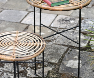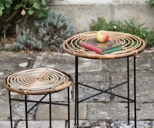 2 tables en rotin sur pieds en métal noirci, vendues par paire, sauf demande via le site.